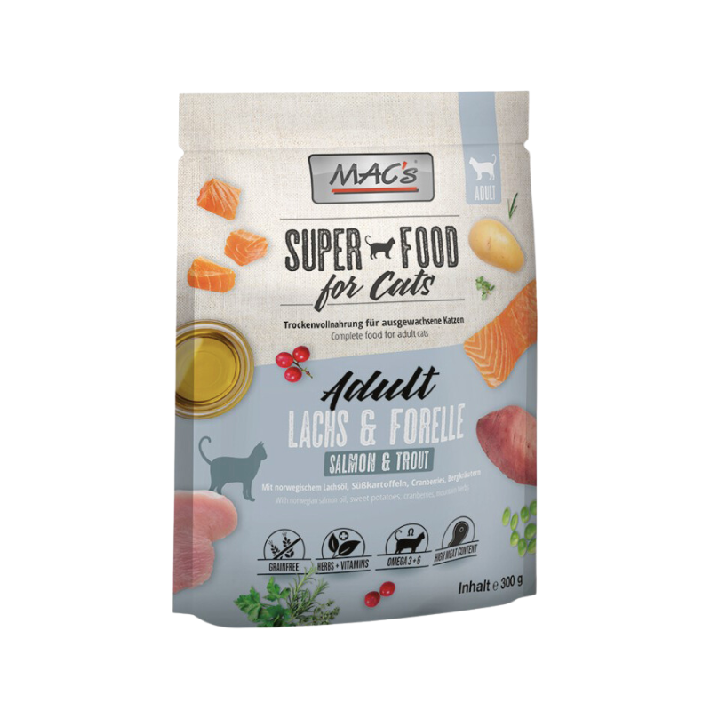 MAC's Adult Lachs & Forelle bietet Ihrer Katze eine köstliche Fischkomposition. Lachs, Forelle und norwegisches Lachsöl sind reich an Omega-Fettsäuren und sorgen für gesunde Haut und ein glänzendes Fell. Cranberries sind natürliche Säurebildner und können bakteriellen Blasenentzündungen vorbeugen.