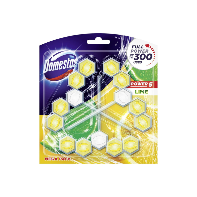 Der Domestos Power 5 Limonen WC-Stein hält die Toilette sauber, glänzend und frisch. Der WC-Reiniger ist mehr als nur ein Toilettenstein, denn der angenehme Limettenduft mit dezenter Note sorgt für Hygiene und Frische im ganzen Bad. Domestos Power 5 steht für hygienische Kraft, langanhaltende Frische, Anti-Kalk-Schutz, kraftvollen Schaum und eine Glanzformel.