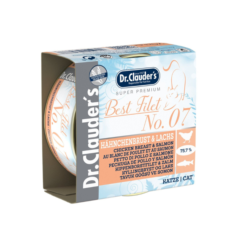 Entdecken Sie Dr. Clauder's Best Filet No 7 - Hühnerbrust & Lachs, den perfekten leichten Leckerbissen für Ihre Katze! Mit nur 80 kcal pro 100g kann dieses Filet dem Trockenfutter als Highlight hi...